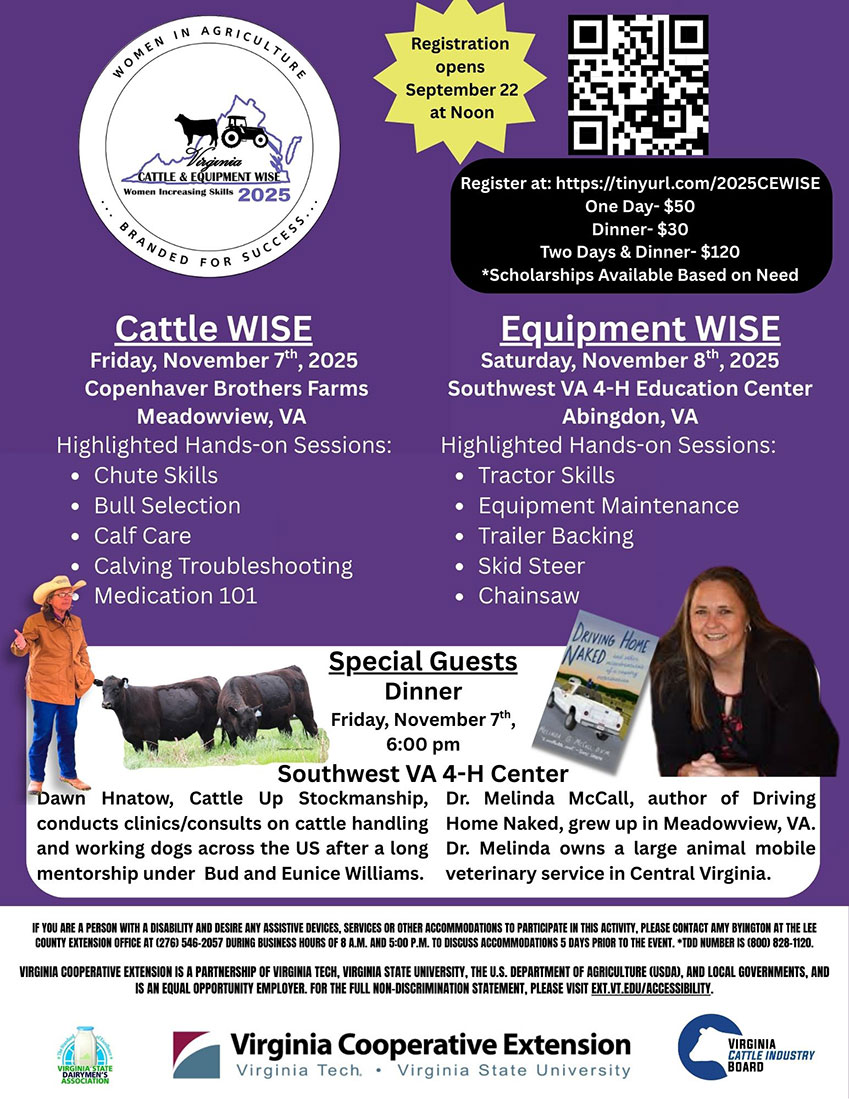 Gain hands-on cattle & equipment skills, taught by women, for women. Since 2021, over 130 women in Virginia have attended WISE conferences created by female Virginia Cooperative Extension Ag Agents. As more female principal operators enter agriculture, we aim to boost their confidence and teach safety measures for machinery and livestock.